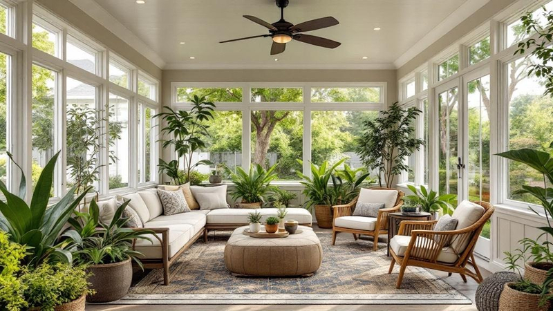 Since your sunroom needs moderate to high — materials must handle sun exposure and temperature fluctuations durability, select materials that align with Biophilic's palette — maximised natural daylight — while meeting the practical demands of the space.