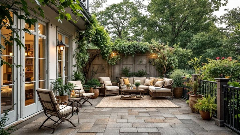 Add hanging planters and compact bench with storage that reinforce the French Country aesthetic. Look for pieces with soft florals & toile patterns to build visual cohesion.