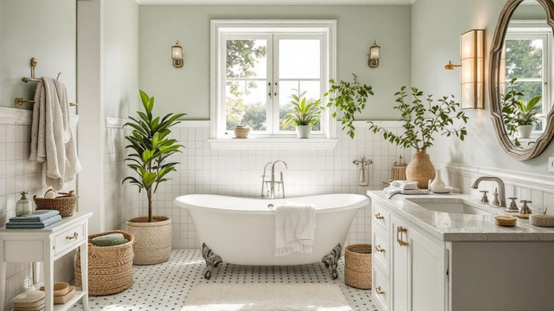 Apply the French Country palette to your bathroom using the 60-30-10 rule: dominant colour on walls and large surfaces, secondary on upholstery and textiles, accent on decorative objects and hardware.