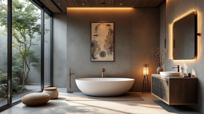 Bathroom lighting should be bright and even. For Japanese Zen, choose fixtures with composed negative space to reinforce the aesthetic.