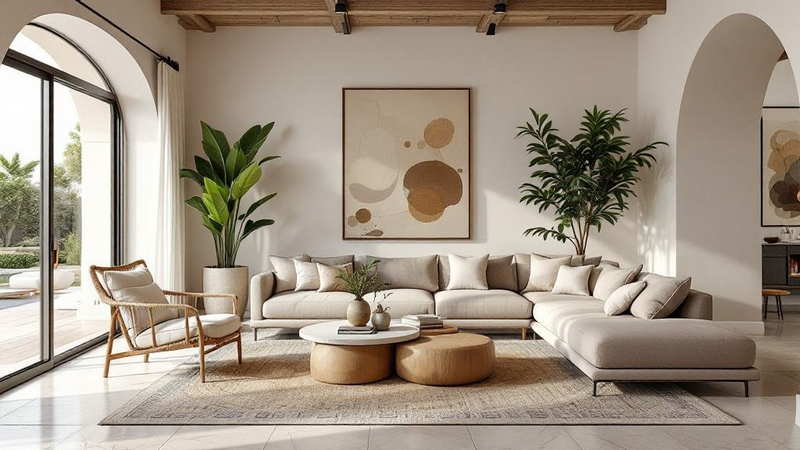 Add coffee table and armchairs that reinforce the Mediterranean aesthetic. Look for pieces with mosaic tiles & terracotta floors to build visual cohesion.