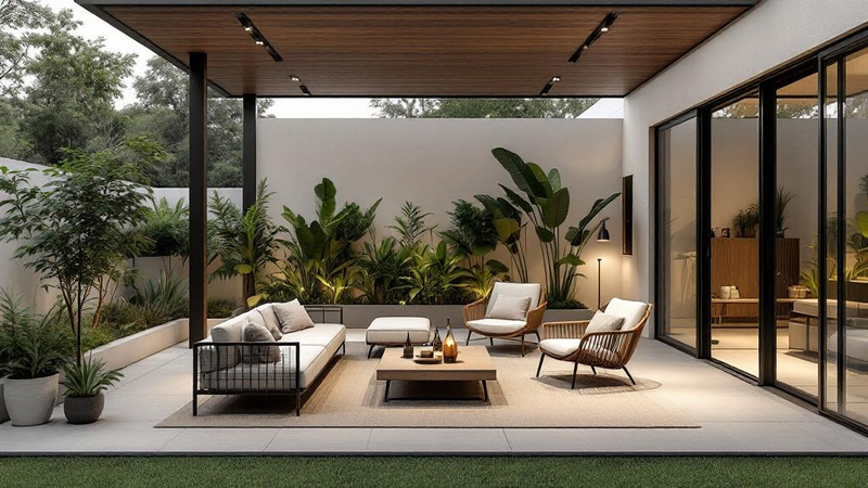 A minimalist outdoor patio typically uses monochromatic colour schemes. Apply your chosen palette with the 60-30-10 rule: 60% dominant neutral on walls, 30% secondary shade on furniture and textiles, and 10% accent colour on decorative details. This creates a cohesive minimalist feel while ensuring the space remains relaxed, inviting, and connected to nature.