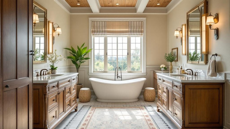 Since your bathroom needs very high — all materials must handle constant moisture, humidity, and cleaning products durability, select materials that align with Traditional's palette — rich wood tones & mouldings — while meeting the practical demands of the space.