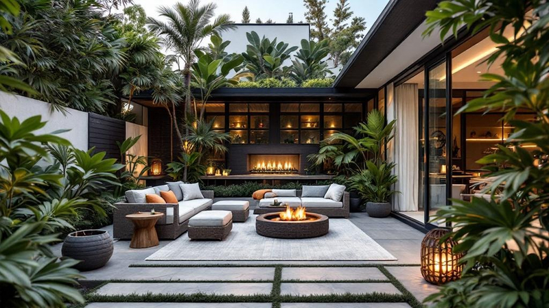 Start with the core principles of Tropical — bold palm & foliage prints — and adapt them to your garden's specific needs. Since a garden is primarily used for outdoor living, planting, and landscaping, focus on blending hardscape and softscape cohesively. Layer in lighting that is subtle pathway and accent lighting to set the right mood.