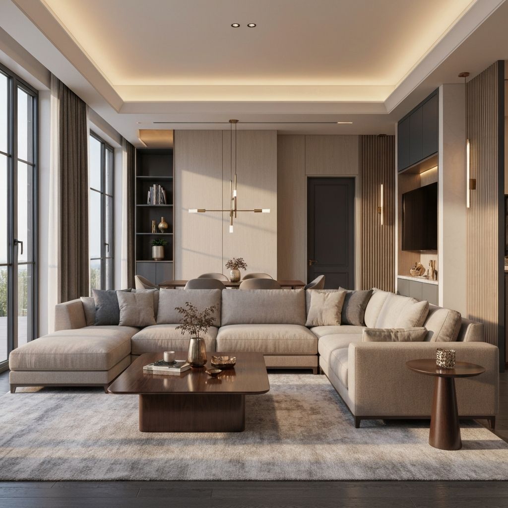 “Spacious luxury living room with floor-to-ceiling windows, warm wood accents, and a statement chandelier”
